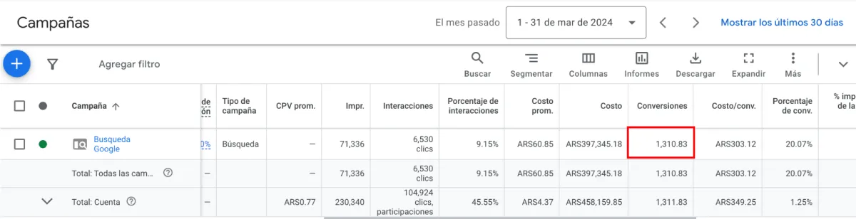 1310 clientes potenciales en un mes, de los cuales 210 se convirtieron en nuevos clientes.